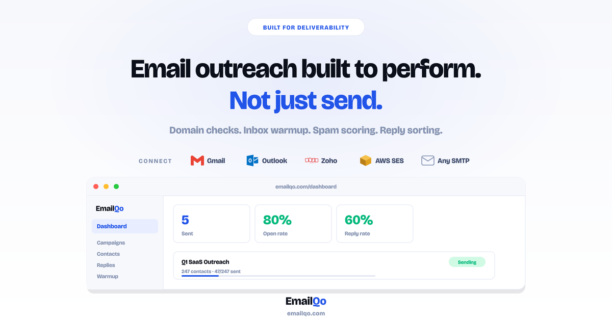 EmailQo is cold-email software that checks every email before it sends — inbox warmup, domain authentication, spam scoring, and AI reply sorting — with flat monthly pricing ($19 / $39 / $89) instead of per-email markup. Connects to your own Gmail, Outlook, Zoho, or Amazon SES account so your sending reputation stays yours, not shared with other users.